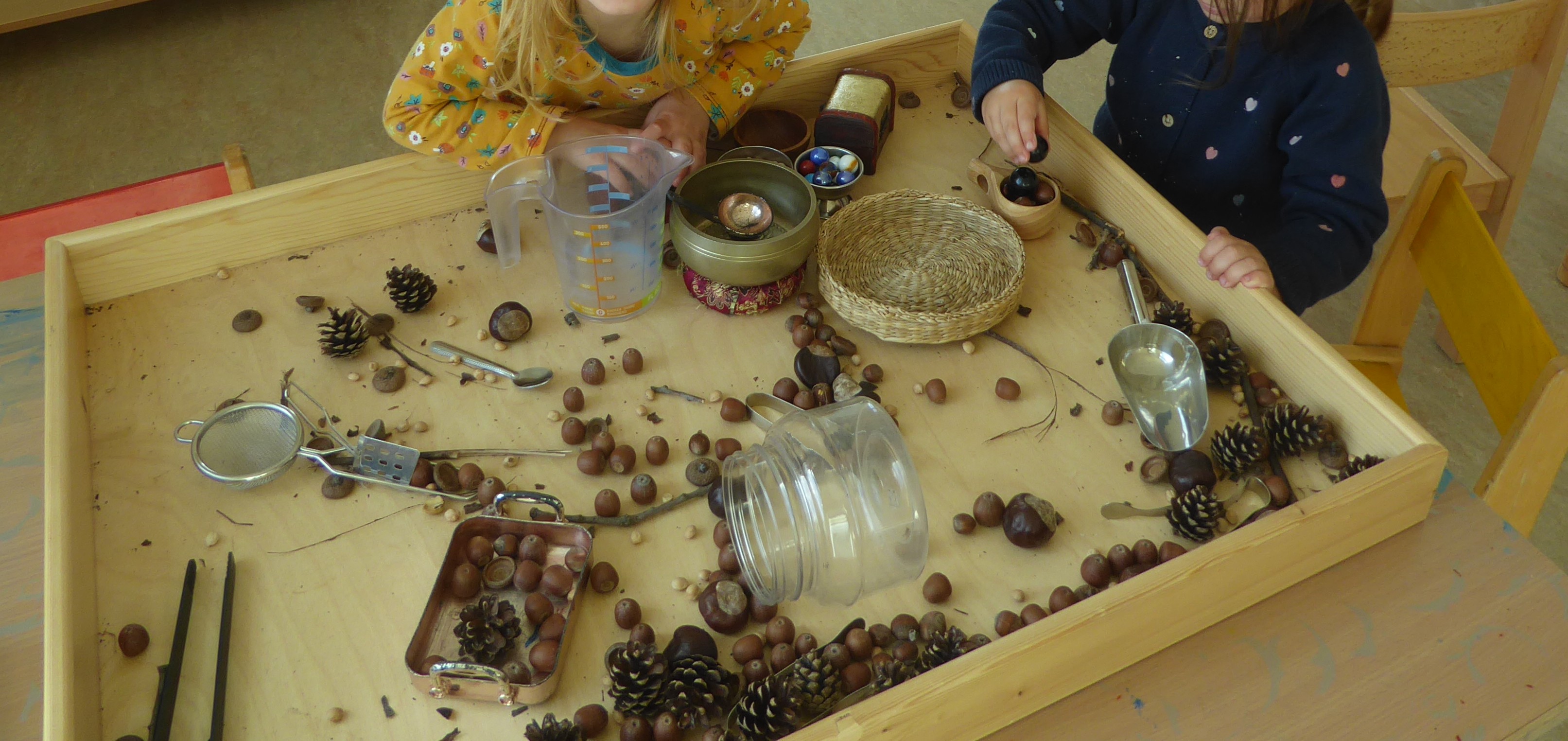 Die Spielwelten - von uns auch Spieltabletts genannt- sind große Experimentierfelder aus Holz, gefüllt mit unterschiedlichen Materialien. Jedes Tablett hat ein anderes Thema. So haben wir ein Knopftablett mit großen Knöpfen, sowie Fäden zum Fädeln und Dosen zum Sortieren, ein Sandtablett mit Küchenzubehör, ein Magnettablett oder ein Naturmaterialientablett mit Tieren. Die Tabletts laden die Kinder ein und fordern sie heraus in ein freies, selbstbestimmtes und tiefes Spiel einzutauchen. Das Material gibt kein Ziel vor, so dass die Kinder ganz nach ihren Fähigkeiten und Interessen spielen können. Es geht einzig um den Prozess. Das Spiel mit den Spielwelten kann zugleich belebend und beruhigend auf das Kind wirken. Das Kind kann erlebte Ereignisse und Erfahrungen im Spiel kreativ verarbeiten und nachspielen. Der umgrenzte Raum des Tabletts hilft gegen eine Reizüberflutung von außen und lenkt die Konzentration und den Fokus des Kindes auf die Spielwelt.